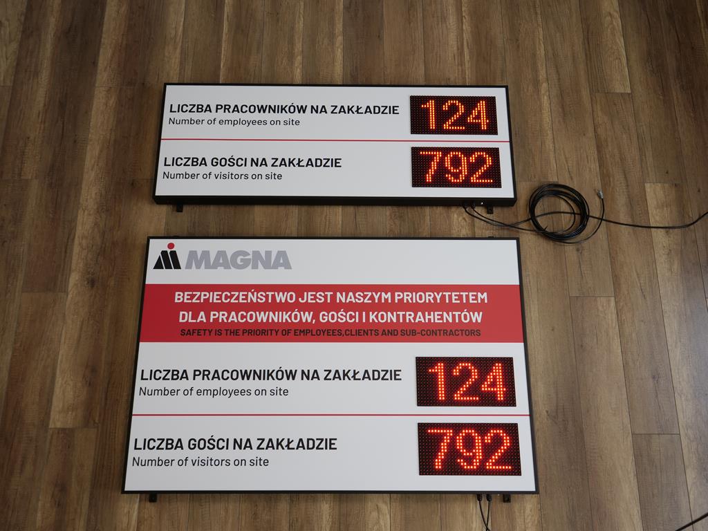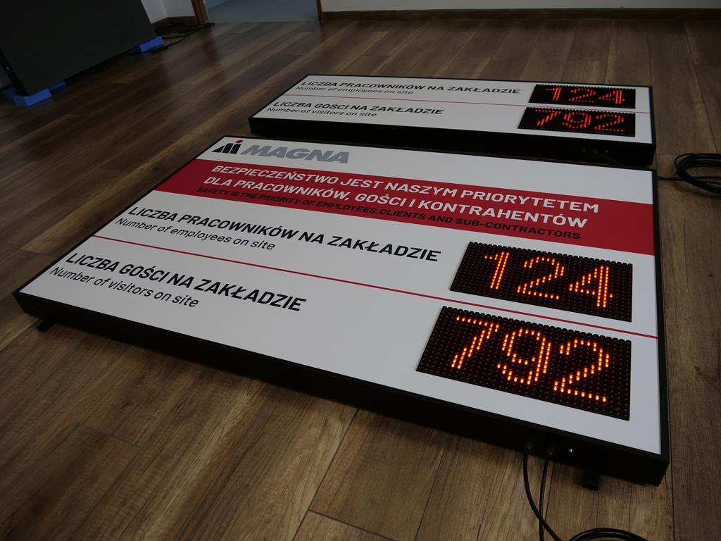 A modern LED information board designed for industrial plants, warehouses, factories, and logistics centers. The device displays, in real time, the current number of employees and visitors present on-site, supporting safety procedures and access control.