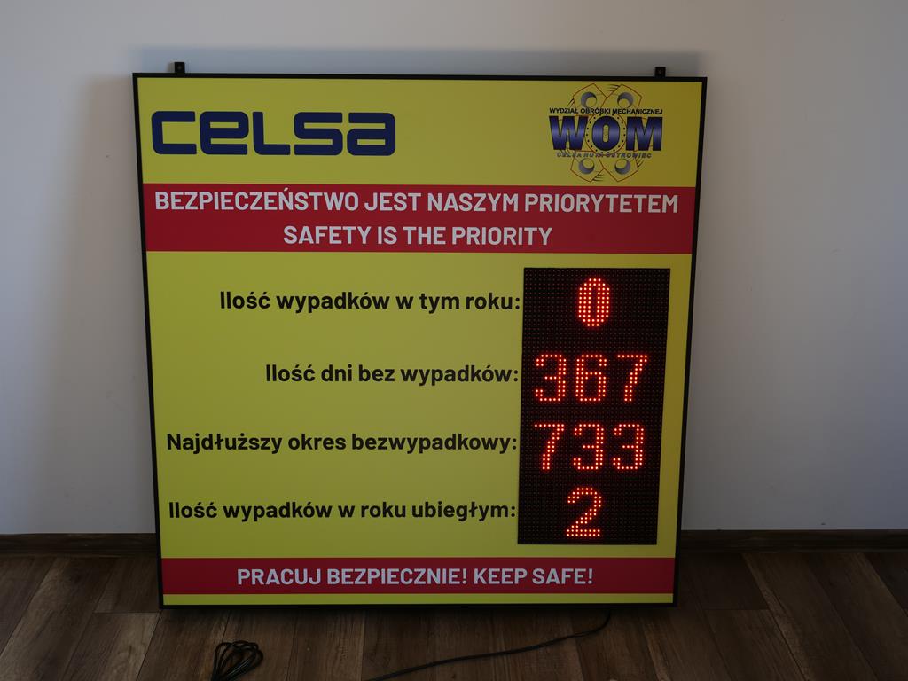 Tablica informacyjna LED służąca do wyświetlania dowolnych komunikatów, oddzielne pole wyświetlające datę z godziną oraz oddzielne pole zliczające ilość dni bez wypadku.